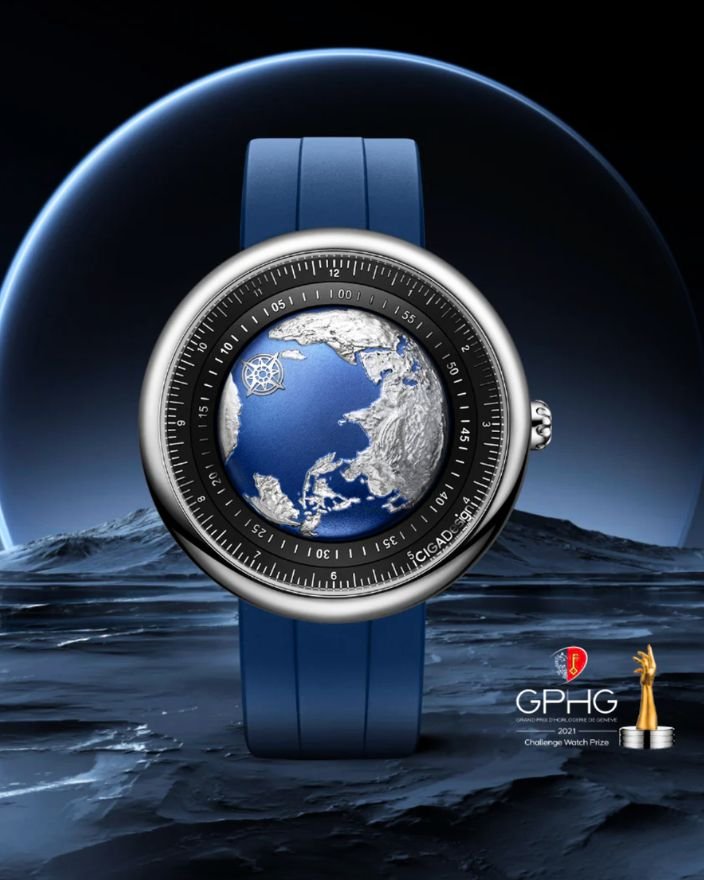 CIGA Design 璽佳「藍色星球」於 2021 年榮獲日內瓦鐘表大賞 (GPHG) 挑戰獎。首創「非同步追隨」獨家技術,藉由改變機芯齒輪比,讓時針轉 30°,分針轉 390°,創造同步指示時分的獨特系統,顛覆傳統讀時方法。