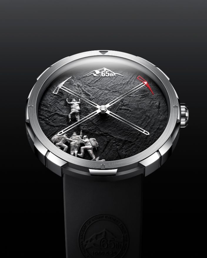在中國人登頂珠峰的65週年之際,品牌特別推出「珠峰藝術腕表」,以微雕工藝打造立體登山者,突破性採用獨特的機械互動設計:每逢12點,被托舉的登山者會「登頂」,5分鐘後回落原點,象徵永不停息的攀登精神。